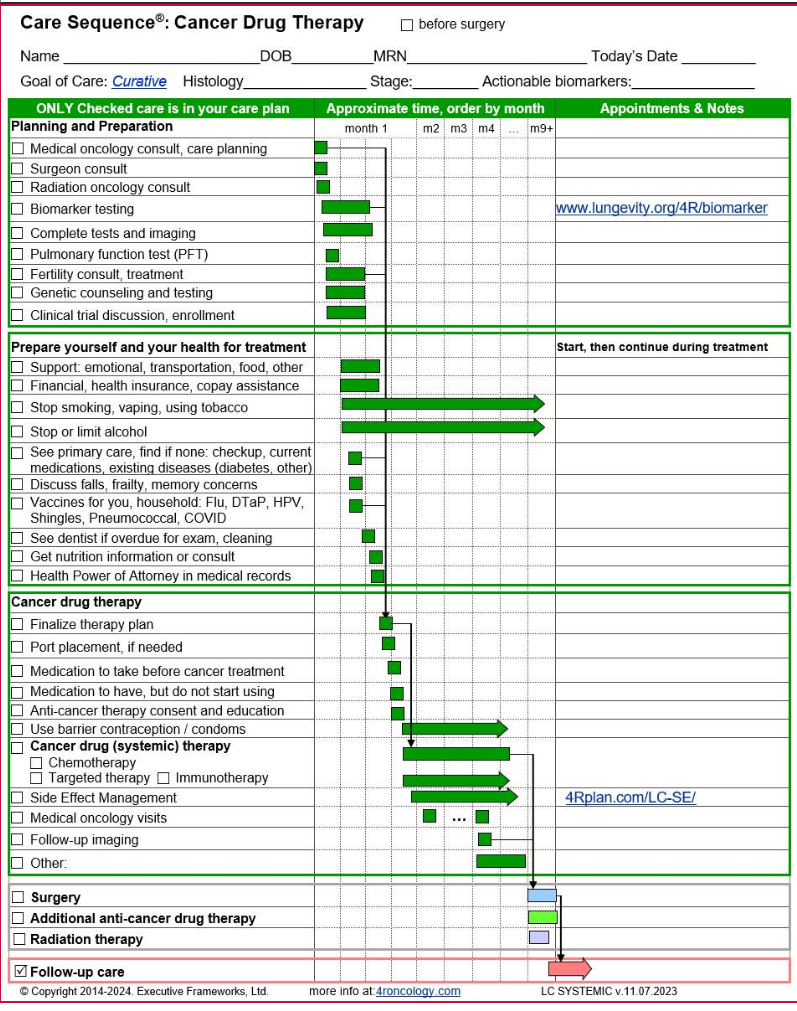 NSCLC患者在治疗前和治疗期间对支持性护理、社会工作和健康维护有相当大的需求。然而,由于非小细胞肺癌护理的复杂性,这些需求通常很难确定和解决。研究者在8个中心(4个社区中心,3个学术中心,1个VA中心)实施了4R肿瘤学模型,并评估了其对NSCLC患者转诊和接受支持性和社会性护理的影响。4R(正确的信息/护理/患者/时间)通过使用面向患者和护理团队的护理计划(称为4R护理流程)来促进全面护理的及时提供和患者参与护理(参见图表中的示例)。在一个简明的护理计划中包含基于指南的直接癌症护理、支持性护理、社会工作和健康维护的护理流程。