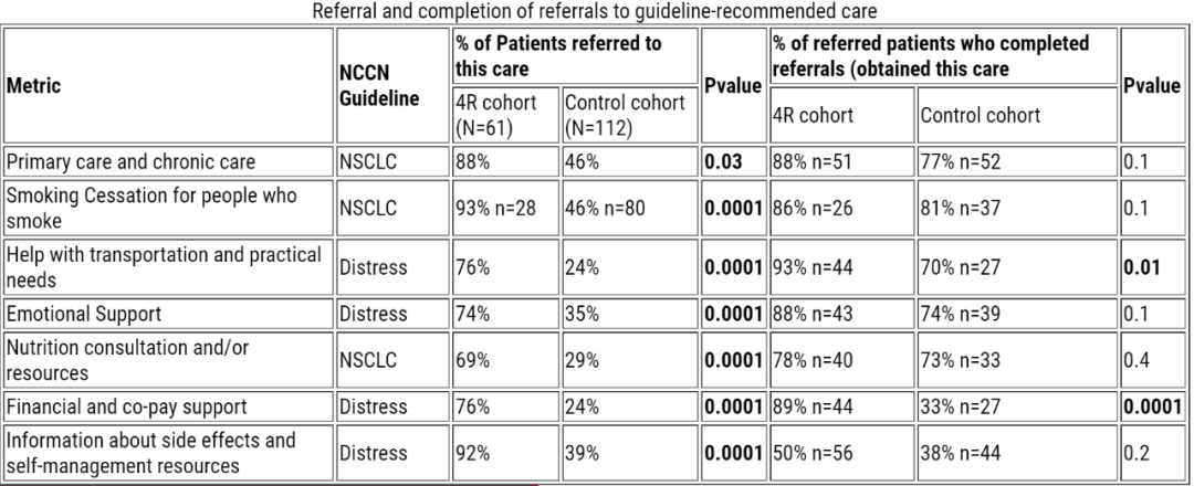 该研究比较了在8个参与中心接受4R治疗的患者队列(4R队列,N=61)和接受4R治疗前实施治疗的患者历史对照队列(对照队列,N=112)之间的7个支持性和社会护理指标。每种类型的护理从两个方面进行评估:患者是否被转诊到这种护理,以及被转诊的患者是否接受了这种护理,即完成了转诊。
