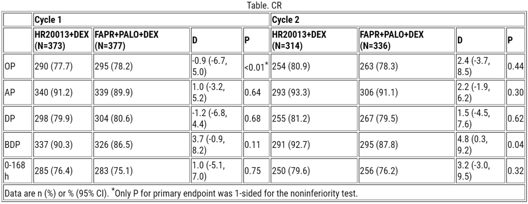 第1周期OP阶段,两组的CR率分别为77.7%vs 78.2%(D=-0.9%;单侧P<0.01),研究达到非劣效性主要终点。