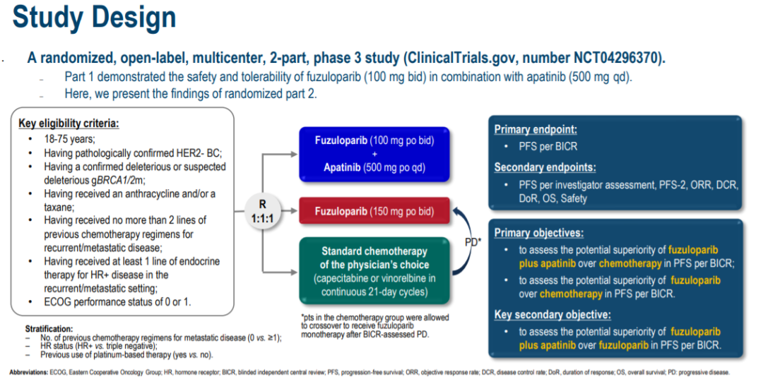 截至2023年12月25日,研究入组了254例BRCA突变的HER2阴性乳腺癌患者,按1∶1∶1比例随机分配至氟唑帕利(100mg bid)联合阿帕替尼(500mg qd)(F+A组)、氟唑帕利(150mg bid,F组)或标准化疗方案进行治疗。主要终点为根据盲态独立中心审查(BICR)评估的PFS,次要终点为根据研究者评估的PFS、PFS-2、客观缓解率(ORR)、疾病控制率(DCR)、持续缓解时间(DoR)、总生存期(OS)和安全性。主要目标为评估氟唑帕利联合阿帕替尼在BICR评估的PFS方面相比化疗的潜在优势。
