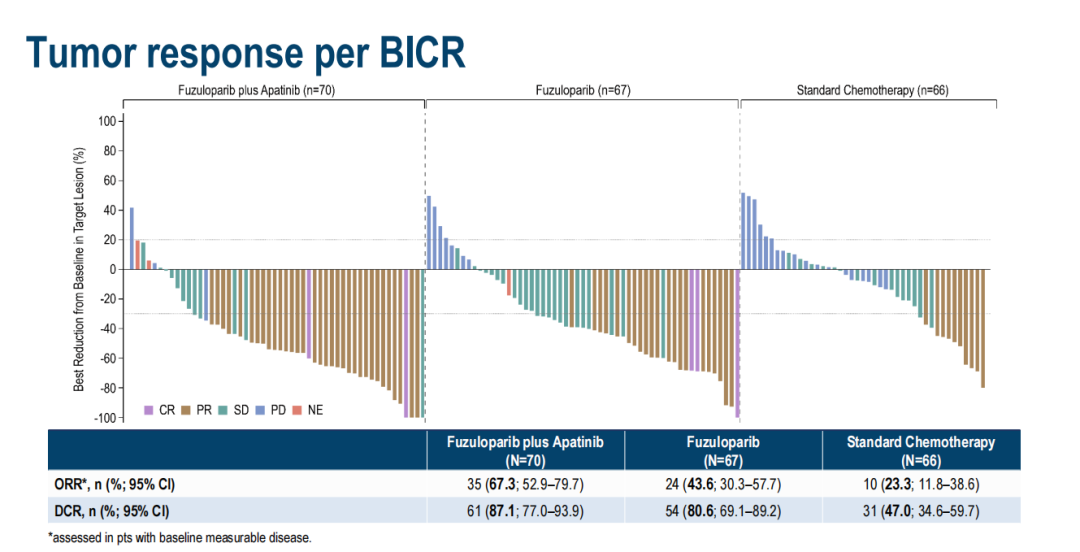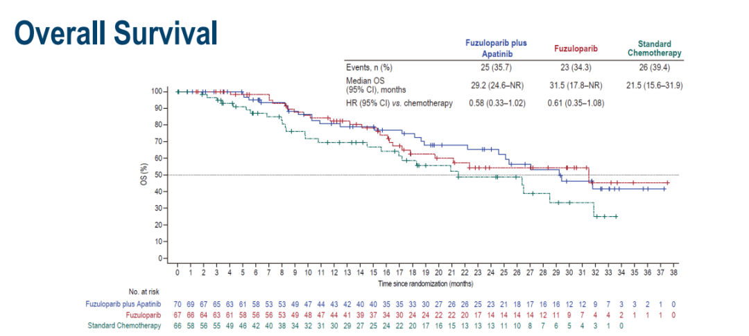 经过多年的努力,该研究结果令人非常振奋。F+A组的mPFS为11个月,ORR为67.3%;F组的mPFS为6.7个月,ORR为43.6%,化疗组的mPFS为3.0个月,ORR为23.3%。