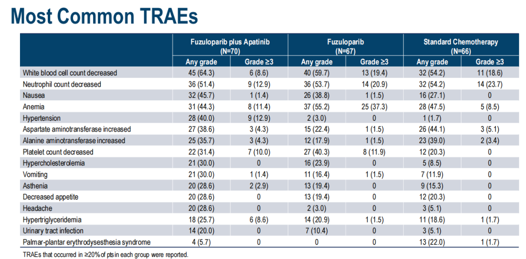 PARP抑制剂最常见的不良反应为贫血,在该研究中,我们发现相较于F组,F+A组任何级别贫血的发生率较低。由此可见,F+A两药联合在延长mPFS的同时,不增加贫血等治疗相关毒性。