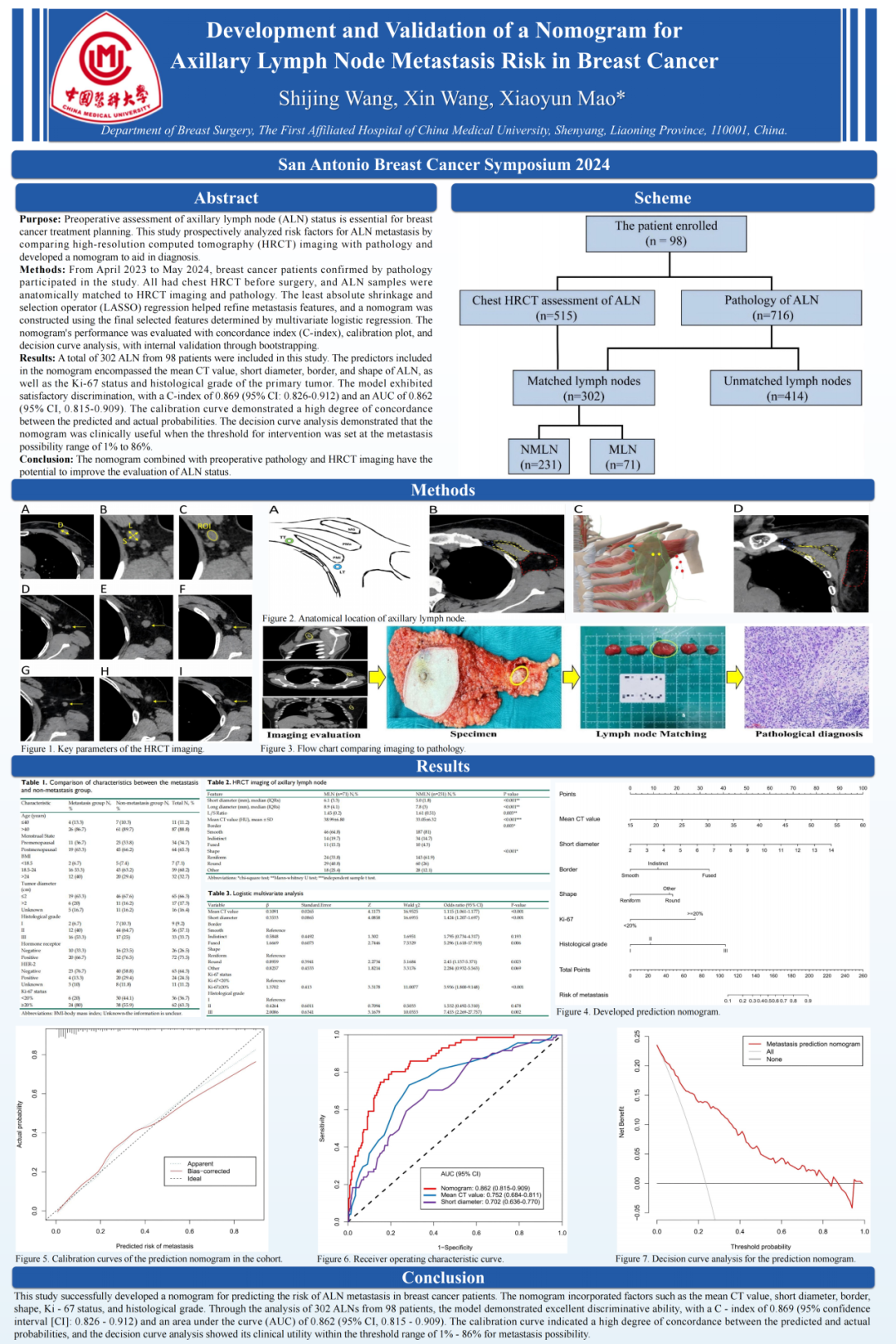 中国医科大学附属第一医院毛晓韵教授领衔的一项前瞻性研究将在大会上进行壁报展示(Poster摘要编号P1-04-04),该研究开发并验证了一种基于术前活检病理和高分辨率CT(High-resolution computed tomography,HRCT)成像的列线图,用于评估乳腺癌患者腋窝淋巴结(Axillary lymph node,ALN)转移风险。该列线图展现出良好的判别能力和校准能力,决策曲线分析表明其在1%~86%的转移可能性阈值范围内具有临床实用性。