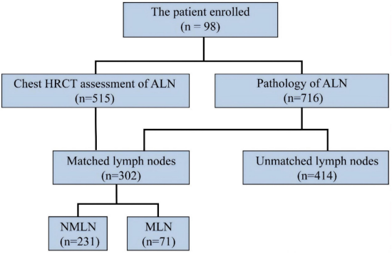 本研究在2023年4月至2024年5月期间成功纳入98例乳腺癌患者,依据腋窝淋巴结是否转移分为两组,对两组基本特征进行对比分析;同时通过HRCT检查与病理检查,成功匹配302个腋窝淋巴结,其中71个为转移淋巴结,231个为非转移淋巴结,结果转移淋巴结在平均CT值、短径、长径、长径/短径比值以及边界和形状等影像学特征方面与非转移淋巴结相比存在显著差异。