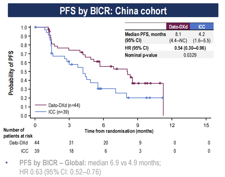 王树森教授:中国队列包含83例患者。在主要研究终点方面,Dato-DXd在中国患者中与全球整体人群表现一致,均能显著延长PFS(8.1 vs.4.2个月),疾病进展或死亡风险降低46%(HR 0.54,95%CI:0.30~0.96),而且从数值上来看,中国队列的PFS相较于全球意向治疗(ITT)人群表现更优。