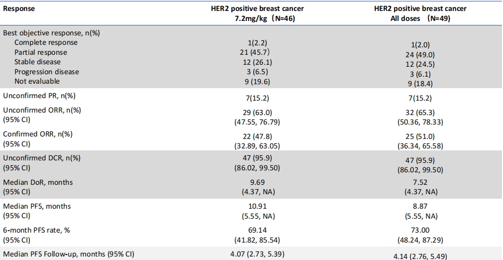 至数据截止时,49名可评估患者客观缓解率(ORR)为65.3%,确认的ORR为51%。还有7名未确认的部分缓解(PR)在随后的随访中均被确认,疾病控制率(DCR)为95.9%。在中位随访4.1个月后,7.2mg/kg剂量组的46例患者的中位无进展生存期(mPFS)约为10.9个月。