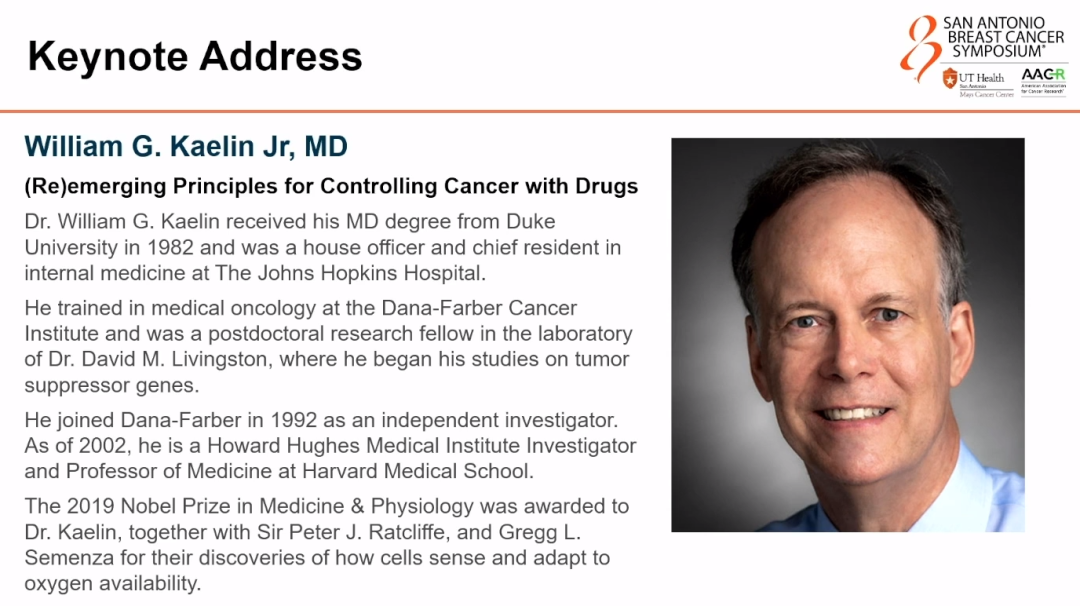 编者按:日前,第47届SABCS大会在美国圣安东尼奥圆满落幕,SABCS是全球最大的乳腺癌领域盛会,来自102个国家的超过1万名注册参会者在为期四天的会议中展示上千篇主题演讲和论文摘要。12月11日,大会进行到第二天,在Keynote Address环节,2019年诺贝尔生理学和医学得主William Kaelin教授围绕“肿瘤遗传学和靶点研发”这一主题发表演讲,赢得现场一致好评。肿瘤瞭望在SABCS现场特邀云南省肿瘤医院张国君教授对讲课内容进行回顾和总结。
