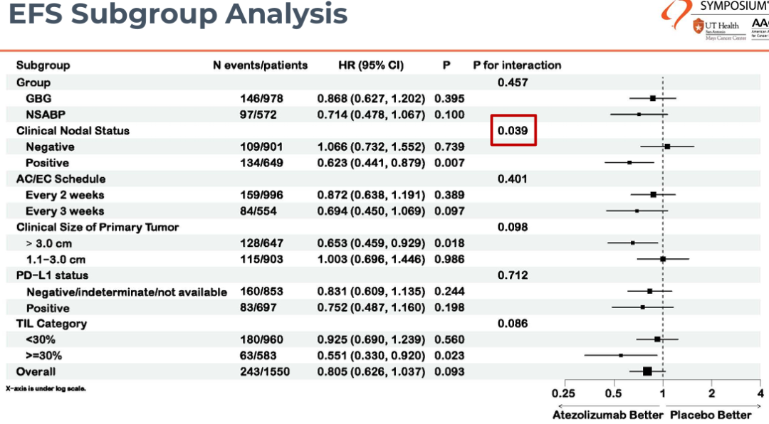 总体来看,新辅助阿替利珠单抗联合化疗,随后接受辅助阿替利珠单抗治疗,与单独的新辅助化疗相比,在高风险早期TNBC患者中未显示出EFS统计学显著改善,阿替利珠单抗组的4年EFS为85.2%,对照组为81.9%(HR=0.8;95%CI,0.62-1.03;P=0.08)。但在新辅助化疗的基础上加用阿替利珠单抗使pCR率从57%增至63%,绝对改善6%。另外,肿瘤负荷大(淋巴结阳性、肿瘤>3cm)或免疫激活水平较高(TIL水平≥30%)的亚组人群加用阿替丽珠单抗存在潜在获益。因此,本项研究虽然未达到主要终点的疗效标准,但结果支持潜在生物标志物(如TIL水平)的转化研究,以确定可能从TNBC新辅助或辅助治疗中添加检查点抑制剂获益的患者亚组。