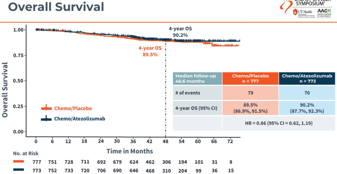 中位随访46.9个月后,阿替利珠单抗组与安慰剂组相比,主要研究终点:4年EFS率在ITT人群分别为85.2%与81.9%;HR 0.8(95%CI 0.62-1.03,P=0.08)。