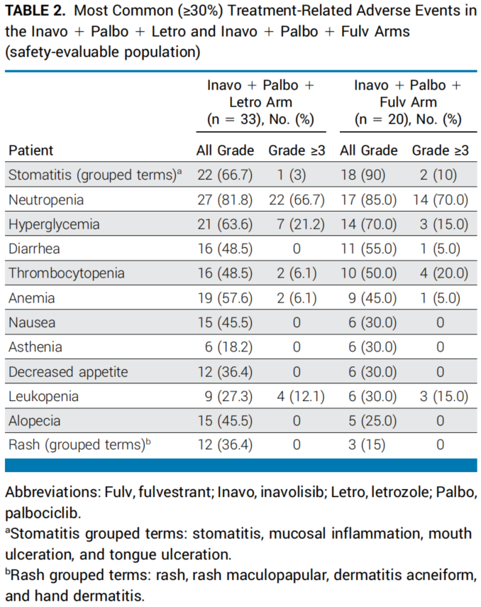研究纳入了年龄≥18岁且携带PIK3CA突变的肿瘤患者。分别接受伊那利塞、哌柏西利和来曲唑(Inavo+Palbo+Letro组;来曲唑组)/氟维司群(Inavo+Palbo+Fulv组;氟维司群组)治疗,直至出现不可接受的毒性或疾病进展。评估来曲唑组在I期和II期剂量扩展阶段采用了3+1+3的剂量递增设计;而评估氟维司群组则在进行II期剂量扩展前设置了一个安全性导入期。