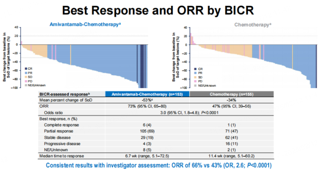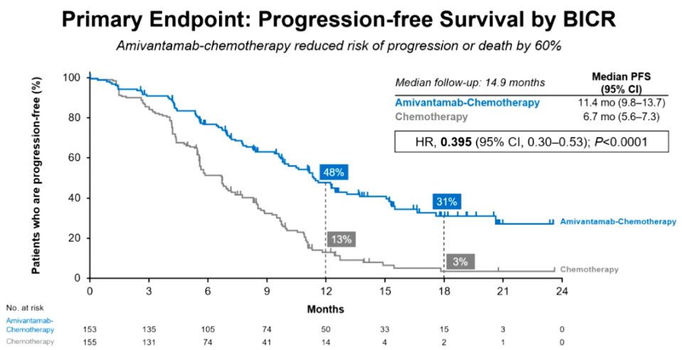 PAPILLON研究是一项全球多中心、随机对照III期临床研究,旨在评估埃万妥单抗联合化疗(ACP方案)与单纯化疗在EGFR ex20ins突变晚期或转移性NSCLC患者一线治疗中的疗效和安全性[6]。主要终点是根据盲态独立中心评估(BICR)评估的无疾病进展生存期(PFS),关键次要终点包括客观缓解率(ORR)、总生存期(OS)及中位缓解持续时间(DoR)等。