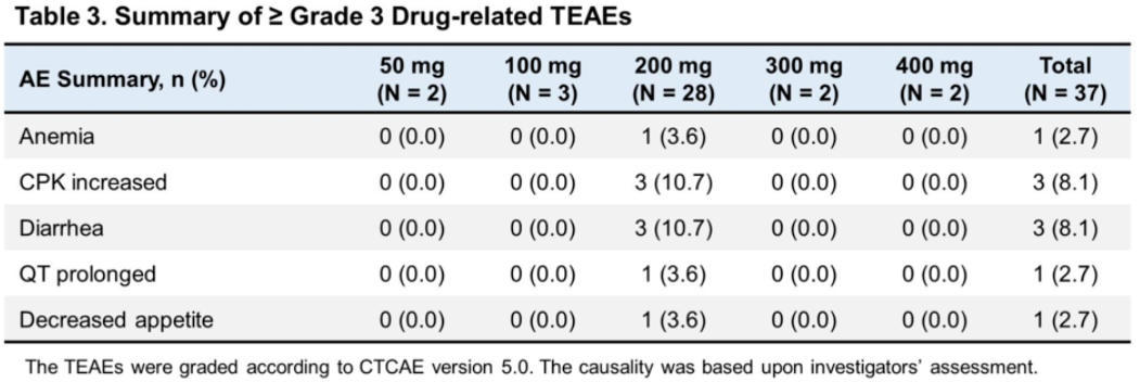 安全性方面,和既往二/后线报道一致,大多数治疗期间不良事件(TEAEs)为CTCAE 1-2级。最常见的≥3级TEAEs包括肌酸磷酸激酶升高(14.3%)、腹泻(7%)、脂肪酶升高(5.3%)和贫血(5.3%),没有患者因药物相关性TEAEs终止治疗。