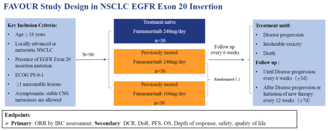 2023年WCLC上公布了伏美替尼治疗EGFR ex20ins突变NSCLC患者的1b期临床研究数据。FAVOUR研究主要纳入EGFR ex20ins突变的局部晚期或转移性非小细胞肺癌患者,随机接受伏美替尼不同剂量组治疗[10]。其中1/3为初治患者,在试验中接受3倍剂量(240mg QD)伏美替尼治疗。