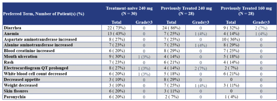 安全性方面,最常见的TRAEs包括腹泻、贫血、口腔溃疡。初治组≥3级的TRAE发生率为13%,未出现治疗相关不良事件导致停药或死亡。