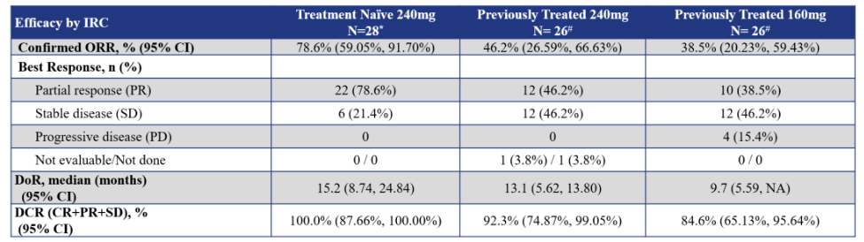 IRC的评估结果显示,初治240mg队列的ORR为78.6%,DCR为100%,mDOR为15.2个月。mPFS数据未出,预计会超过10个月。
