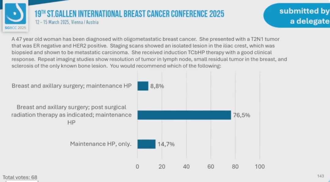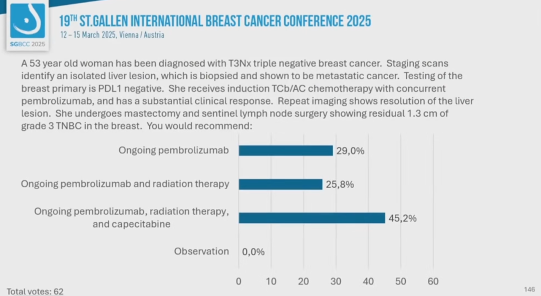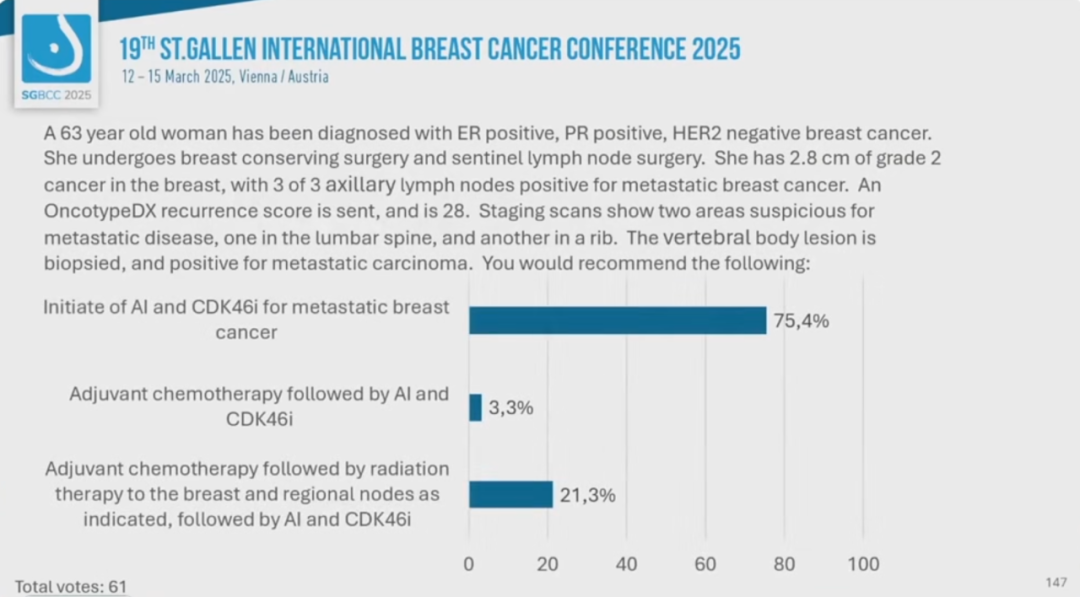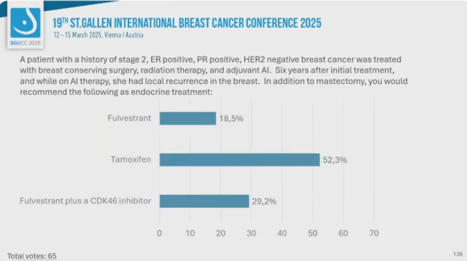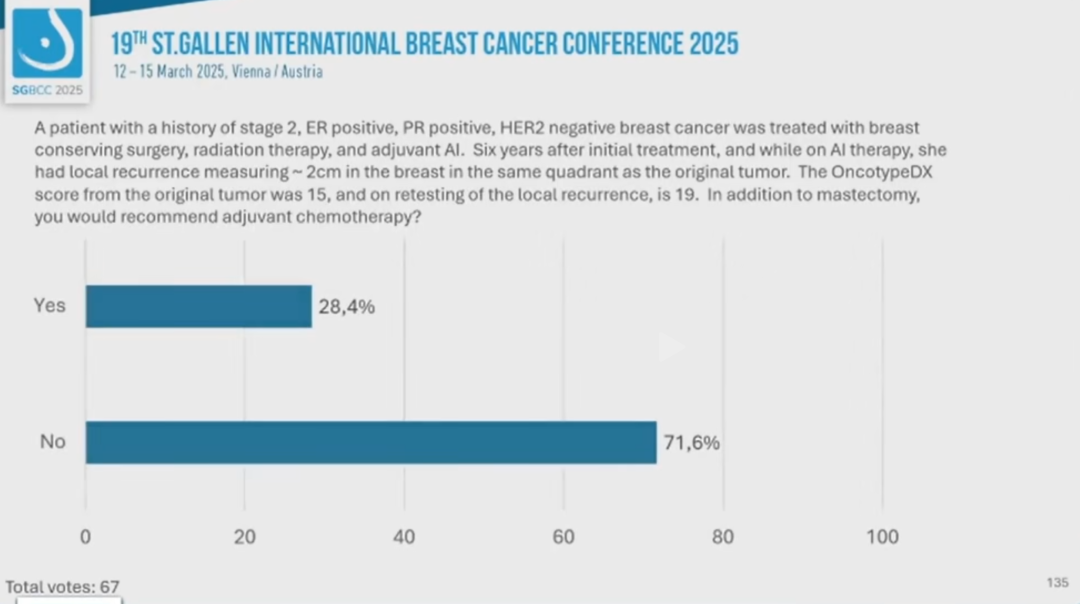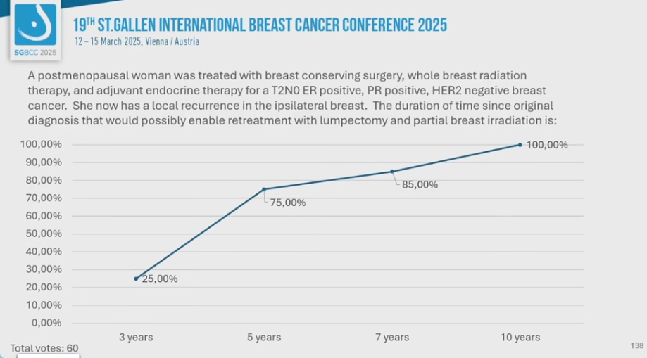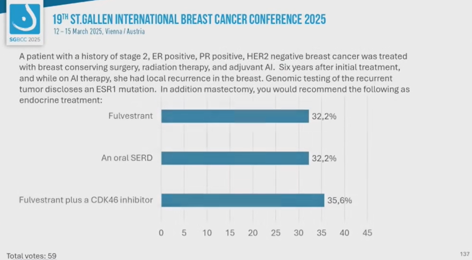 第19届St.Gallen国际乳腺癌大会(SGBCC 2025)于当地时间2025年3月12~15日在音乐之都维也纳拉举行。大会的最后一天,专家投票压轴登场。继之前四篇后,《肿瘤瞭望》整理了St Gallen国际乳腺癌共识的最后一部分,包括局部复发乳腺癌治疗章节、寡转移性乳腺癌章节的专家投票,现成文如下,与大家一起感受早期乳腺癌治疗决策的圣加伦氛围。