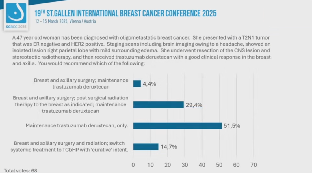 编者按:第19届St.Gallen国际乳腺癌大会(SGBCC 2025)于当地时间2025年3月12~15日在音乐之都维也纳拉举行。大会的最后一天,专家投票压轴登场。继之前四篇后,《肿瘤瞭望》整理了St Gallen国际乳腺癌共识的最后一部分,包括局部复发乳腺癌治疗章节、寡转移性乳腺癌章节的专家投票,现成文如下,与大家一起感受早期乳腺癌治疗决策的圣加伦氛围。