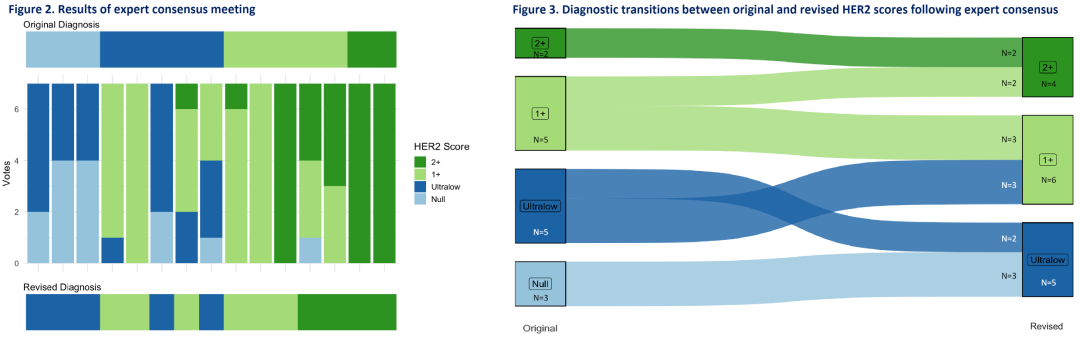 有8例(53.3%)产生显著分歧(定义为至少2例病理专家持不同意见),包括原始诊断HER2 0的3例(所有病例均被重新分类为HER2超低表达)、HER2超低表达的3例(1例升级为HER2 2+),HER2 1+的2例(均升级为HER2 2+)。