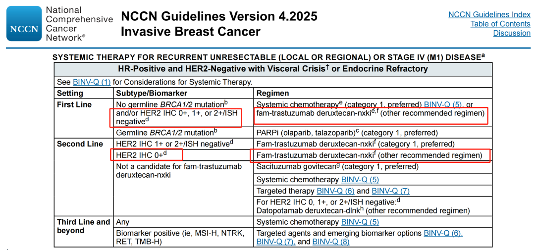 这次DB-06研究的事后分析显示,T-DXd相较于卡培他滨和紫杉醇(包括白蛋白-紫杉醇和紫杉醇)均显示PFS、PFS2、ORR和DoR的改善,支持T-DXd作为经内分泌治疗但未接受过化疗的HR+/HER2低表达或超低表达晚期乳腺癌患者的治疗选择。目前,T-DXd已经在国际上获批HER2超低表达相关适应症,最近更新的NCCN、ESMO指南中[4-5],也首次纳入了HER2超低表达的治疗推荐,将T-DXd作为存在内脏危象或内分泌难治性的HER2低表达或超低表达HR+晚期乳腺癌患者的一线治疗(图6)。