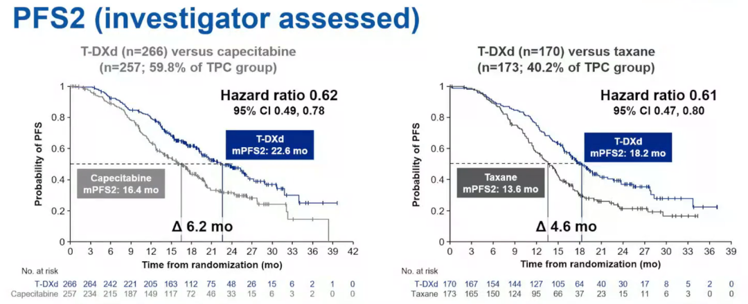 图3.T-DXd对比卡培他滨和紫杉醇的PFS2(研究者评估)