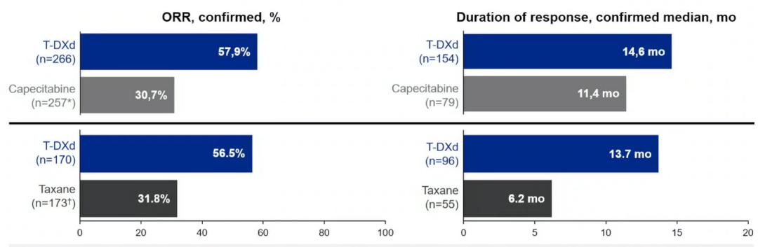 图2.T-DXd对比卡培他滨和紫杉类的ORR和DoR(BICR根据RECIST 1.1评估)
