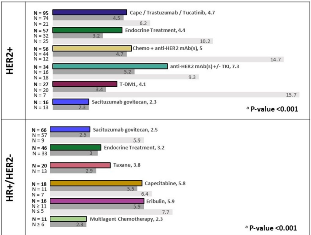 最常使用的一线治疗方案是曲妥珠单抗+图卡替尼+卡培他滨(58%)和曲妥珠单抗联合化疗(15.8%),中位至治疗失败时间(TTF)分别为3.7个月2.8个月