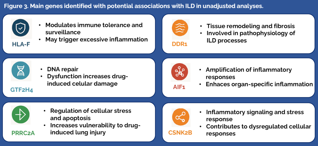 研究人员通过大规模SNP基因分型(涵盖超过193万个药物基因组变异),揭示了24个与ILD显著相关的基因,包括在肺部炎症中起作用的基因(如IL4R,IL2R)。在染色体6p21.3的人类白细胞抗原(HLA)区域发现了与ILD相关的33个基因,这些变异聚集在以下不同位置上的基因: