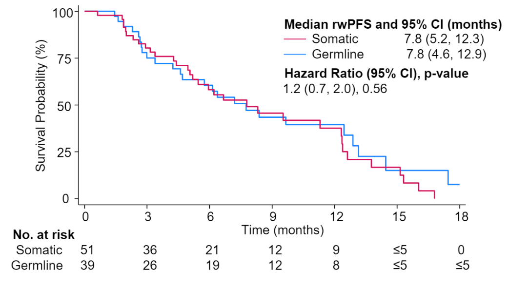无论是BRCA1(7.8个月)还是BRCA2突变(8.3个月),其rwPFS都相较于BRCA野生型患者更短(P=0.04);BRCA胚系突变和BRCA体系突变患者的中位rwPFS相似,均为7.8个月(HR 1.2,P=0.56)。