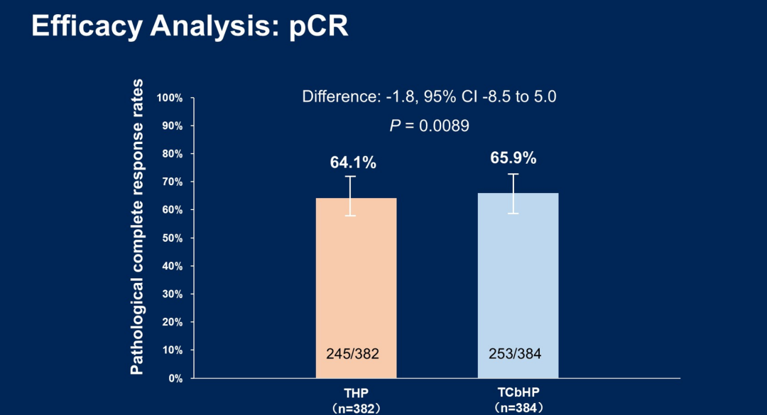 疗效分析发现,THP组的pCR为64.1%,而TCbHP组为65.9%(绝对差异-1.8%,95%CI:-8.5~5.0;比值比0.93,95%CI:0.69~1.25;P=0.0089)。
