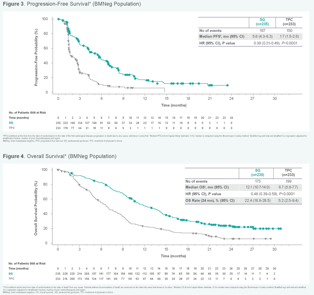 该研究中无脑转移患者共468例,在此类人群中,戈沙妥珠单抗较TPC提升mPFS 3倍以上,为5.6个月vs 1.7个月(HR 0.39,95%CI:0.31-0.49,P<0.0001);延长mOS近2倍,为12.1个月vs 6.7个月(HR 0.48,95%CI:0.39-0.59,P<0.0001);改善客观缓解率(ORR)达7倍,为35%vs 5%[9]。事后分析显示,无论Trop-2表达水平如何,患者均可从戈沙妥珠单抗治疗中取得获益[10]