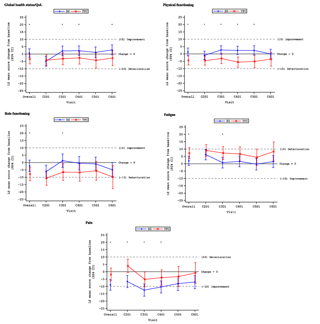 安全性方面,戈沙妥珠单抗治疗整体安全性可控。ASCENT研究中戈沙妥珠单抗组中常见的≥3级治疗相关不良事件(TRAE)为中性粒细胞减少(51%)和腹泻(10%)[11]。生活质量方面,ASCENT研究患者报告的结局(PRO)取得了积极结果,显示戈沙妥珠单抗较TPC在整体生存状况/生活质量(GHS/QoL)、生理机能(PF)、生理职能(RF)、虚弱、疼痛五个QoL维度的得分均具有显著改善[12]
