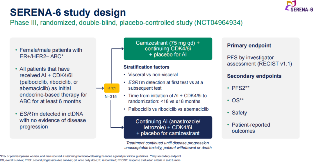 既往在晚期HR+/HER2-乳腺癌患者内分泌治疗过程中我们发现,ESR1突变是导致AI耐药的一个关键原因,且大多在AI使用后才出现。SERENA-6是一项III期双盲、随机研究,旨在评估Camizestrant与CDK4/6抑制剂(包括哌柏西利、瑞波西利、阿贝西利)联合治疗相较于AI与CDK4/6抑制剂联合治疗在疾病进展之前出现ESR1突变(ESR1m)的HR+/HER2-晚期乳腺癌中的疗效和安全性。该研究的设计非常巧妙,在患者一线治疗出现疾病进展之前,通过ctDNA检测到血液中耐药的信号,找出存在ESR1突变的人群,及早进行治疗干预,即转换成Camizestrant联合CDK4/6抑制剂进行针对性治疗。