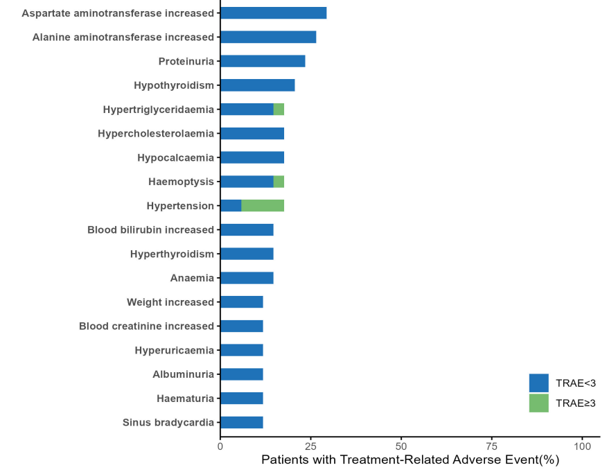 SSGJ-707 10mg/kg Q3W最常见的TRAEs(≥10%的患者)包括天冬氨酸转氨酶升高、丙氨酸转氨酶升高、蛋白尿、甲状腺功能减退、高甘油三酯血症、高胆固醇血症、低钙血症、咯血和高血压(图4)。