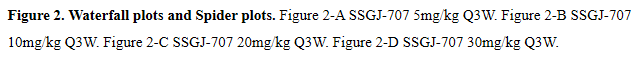 图2瀑布图和蜘蛛图。图2-A SSGJ-707 5mg/kg Q3W。图2-B SSGJ-707 10mg/kg Q3W。图2-C SSGJ-707 20mg/kg Q3W。图2-D SSGJ-707 30mg/kg Q3W。