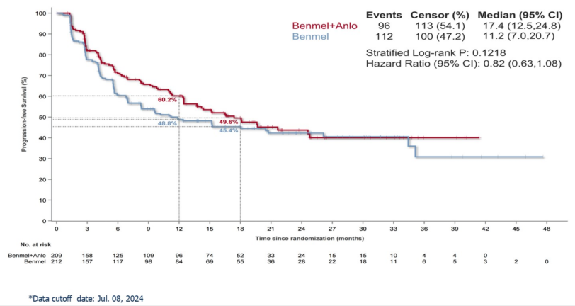 IRC评估的mPFS:联合治疗组为17.4个月(95%CI:12.5~24.8),单药治疗组为11.2个月(95%CI:7.0~20.7),HR 0.82(95%CI:0.63~1.08;Log-rank P=0.1218)。