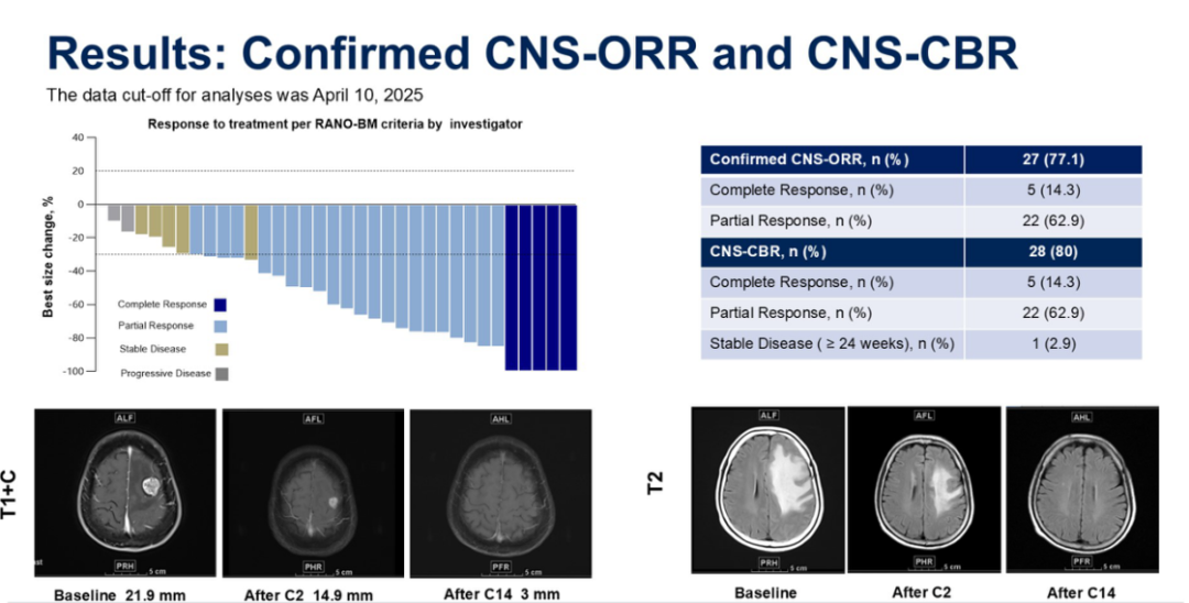 在意向治疗人群(即至少接受过一个周期研究治疗的患者)中,CNS-ORR达到77.1%(27/35),其中5例完全缓解(Complete Responses,CR),22例部分缓解(Partial Responses,PR),确认的CNS-ORR为71.4%(25/35)。在23例出现疾病进展的患者中,69.6%(16/23)的患者首次进展部位为脑。