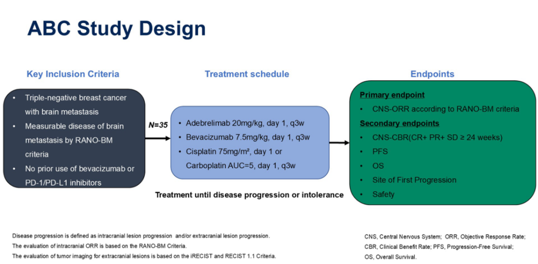 这是一项单中心、单臂、II期临床试验,纳入具有活动性脑转移的三阴性乳腺癌患者。共35名参与者接受了由阿得贝利单抗、贝伐珠单抗联合顺铂/卡铂组成的三联治疗方案。纳入标准要求患者既往未使用过贝伐珠单抗或抗PD-1/PD-L1药物。对于既往使用过铂类药物的患者,仅在铂类敏感疾病的情况下允许入组。主要研究终点为中枢神经系统客观缓解率(Central Nervous System Objective Response Rate,CNS-ORR),次要研究终点包括中枢神经系统临床获益率(Central Nervous System Clinical Benefit Rate,CNS-CBR)、无进展生存期(Progression-Free Survival,PFS)、总生存期(Overall Survival,OS)、首次进展部位以及治疗的安全性。