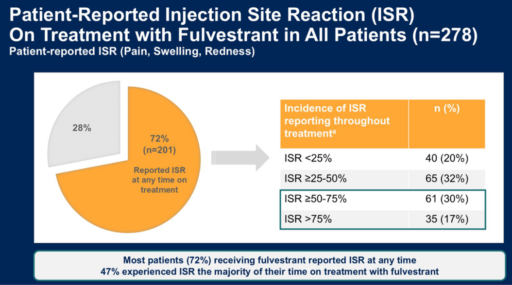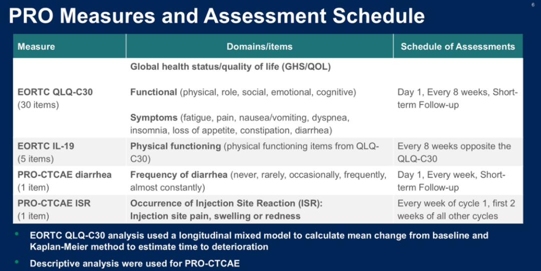 在基线(BL)时以及每8周直至治疗结束时,使用欧洲癌症研究与治疗组织(EORTC)QLQ-C30核心问卷进行评估。预先指定的QLQ-C30分析采用纵向混合模型对重复测量数据进行处理,以计算基线与基线后至少一次得分之间的平均变化。每周对患者进行PRO-CTCAE(腹泻频率)评估,报告范围为0(从未)到4(几乎持续存在)。对接受氟维司群治疗的患者,在注射后两周内每周进行PRO-CTCAE(注射部位反应[ISR])评估,报告是否出现疼痛、肿胀、发红等症状。采用描述性分析方法对PRO-CTCAE进行分析。