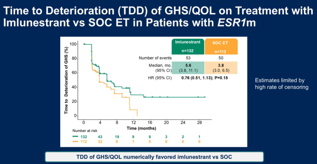 EMBER-3研究的患者报告结局显示,在存在ESR1突变的患者中,与标准治疗相比,imlunestrant单药治疗可改善患者的整体健康状况/生活质量及身体功能评分,这与疗效结果相吻合。尽管根据CTCAE定义的注射部位反应发生率较低,但PRO-CTCAE评估显示注射部位反应的发生率较高,这表明这一具有临床相关性的不良事件可能被医生低估了。总体而言,这些结果支持imlunestrant相较于现有标准治疗的有效性和安全性。