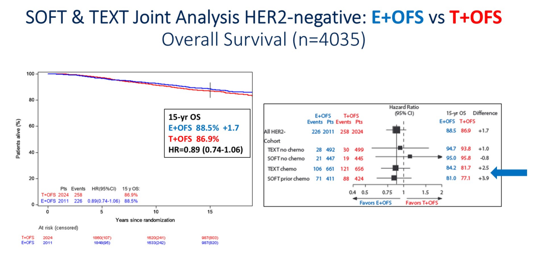 此次报道SOFT/TEXT联合分析的15年数据显示,总体而言,OFS+AI、OFS+TAM联合治疗优于TAM单药治疗。这些结果与临床实践相符。尤其在需要化疗的复发高危患者中,包括年轻(<35岁)、组织学3级等恶性程度往往较高的肿瘤中,OFS+AI显示了持续生存获益。15年的随访结果进一步坚定了我们在临床中使用这种治疗策略的信心。