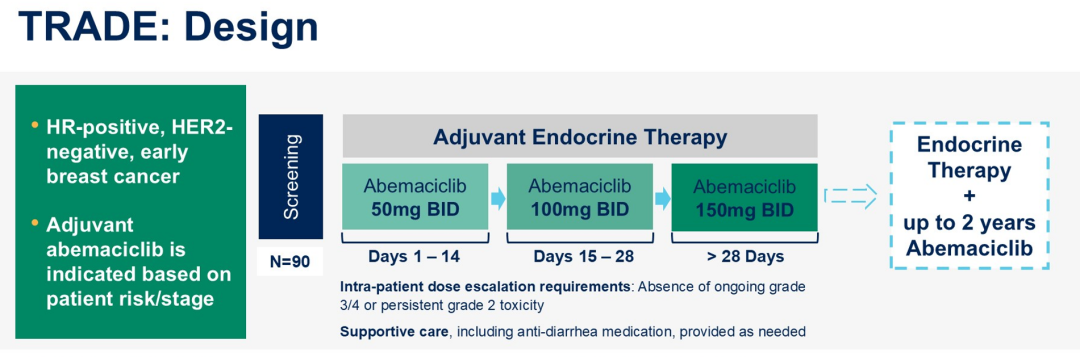 王昕教授:毒副作用管理是辅助内分泌治疗中非常重要的内容,无论是早期的他莫昔芬(TAM)、芳香化酶抑制剂(AI),还是后来的CDK4/6抑制剂。药物疗效再好,如果患者因各种原因停药,其疗效自然也无法达到预期。丹娜法伯癌症中心开展的这项研究很有意思,他们采用一种类似于晚期治疗中经常使用的“爬坡剂量”方案。我们知道,阿贝西利在monarchE研究中取得了非常出色的结果,但其不良反应也不容忽视:68.1%的患者需要调整阿贝西利剂量,16.6%的患者因不良事件停止治疗。阿贝西利常见的不良反应包括腹泻和中性粒细胞减少等。在临床实践中,我们主要根据monarchE研究使用150mg的阿贝西利进行辅助治疗,但如果患者不耐受,就会降低剂量,这种情况在临床上较为常见。