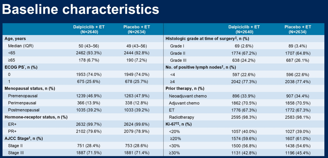 在高危人群的设定方面,DAWNA-A研究的入组人群均为腋窝淋巴结阳性的患者,包括≥4枚腋结阳性,或1-3枚腋结阳性且存在以下高危因素之一:肿瘤直径≥5cm、组织学分级3级、新辅助治疗后残存浸润性乳腺癌,以及Ki-67≥30%。这样的高危人群界定非常贴合临床实践。对照NATALEE、monarchE等研究来看,DAWNA-A研究的高危人群定义有一定的差异,尤其是在Ki-67≥30%,临床通常将其视为相对高危因素;再者是该研究对新辅助治疗后的入组条件也有较为清晰的说明,凡有浸润性残存疾病者均可入组,且该研究中新辅助治疗的患者比例达到近30%,绝经前/围绝经期患者的比例达到近60%,这些情况都非常符合中国的临床实践。