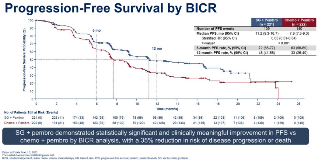 《肿瘤瞭望》:ASCENT-04研究在2025年ASCO大会上公布了重要结果,数据显示戈沙妥珠单抗(SG)联合帕博利珠单抗(pembro)一线治疗PD-L1阳性三阴性乳腺癌(TNBC)患者,由BICR评估的PFS显示有显著改善,且降低了35%的疾病进展或死亡风险。请您对该研究数据进行解读,并分享下这一结果有何重要意义?