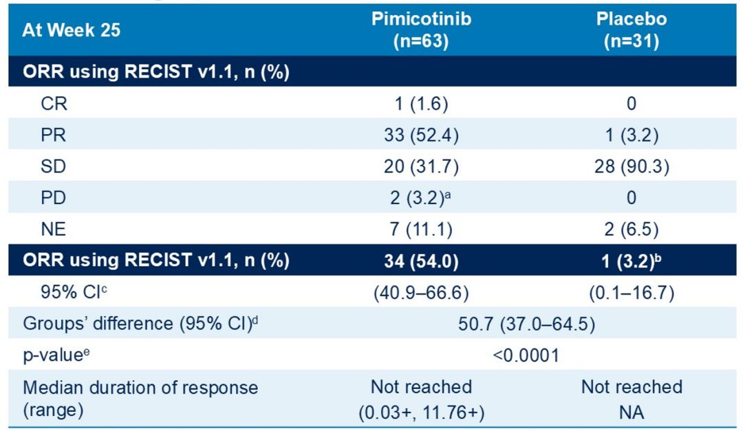 Pimicotinib是一种高选择性、高效CSF-1R酪氨酸激酶抑制剂,既往的1/2研究显示其TGCT有积极的治疗活性。为了进一步验证其疗效和安全性,我们开展了这项全球多中心III期MANEUVER研究。该研究共纳入94例有症状的活动性TGCT成人患者,在第一阶段(双盲期)按照2:1的比例随机接受口服Pimicotinib 50mg QD或安慰剂治疗,随访24周后进入第二(开放期)和第三(扩展期)部分。研究的主要终点是第25周时由盲法独立审查委员会(BIRC)根据RECIST v1.1评估的客观缓解率(ORR)。