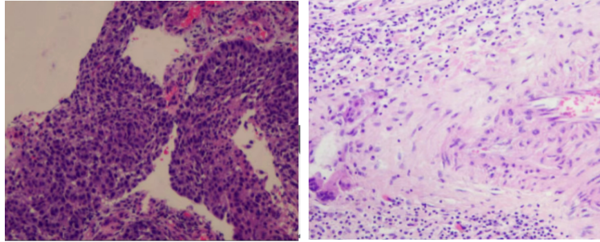 图5:由左至右分别展示病理基线(A)及免疫化学治疗后术后病理图片(B)。
