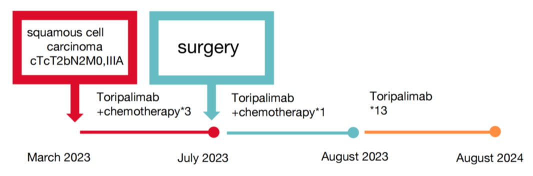 患者新辅助治疗无严重不良反应末梢神经炎I级,白细胞减少I级,心肺功能良好,3周期新辅助治疗后无手术禁忌证,患者于2021-09-02我院外科手术切除,术式:胸腔镜辅助下右肺上叶及部分中叶切除,下叶楔形切除,右侧第4肋骨部分切除,肺门纵隔淋巴结清除,胸腔粘连松解术。术后病理:肿物范围约5.2*2.6*2cm,侵透胸膜,侵及肋骨,肋骨长9.5cm,右肺上叶:见癌组织片巢状分布,浸润性生长,局部侵骨组织,见大量坏死。结合免疫组化及病史,鳞状细胞癌伴治疗后改变,侵骨组织。右肺下叶:纤维组织增生多量炎细胞浸润。淋巴结未见转移癌0/32:(D1)2组0/6、(D2)4组0/5、(D3)7组0/3、(D4)8组0/2(D5)10组0/7、(D6)11组0/3、(D7)12组0/2、(D8)13组0/2、(D9)14组0/2。pT3N0M0 IIB期,未达到MPR。术后行8周期替雷利珠单抗辅助治疗。目前患者生活质量良好,DFS已超过4年,仍在定期随访中。