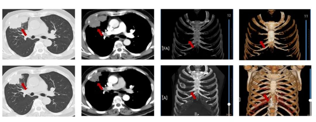 图1:由上至下分别展示基线(A.)及免疫化学治疗后改变(B.)。红色箭头指示病灶位置,由左至右分别为右肺肿物肺窗、右肺肿物纵隔窗、肋骨三维重建。