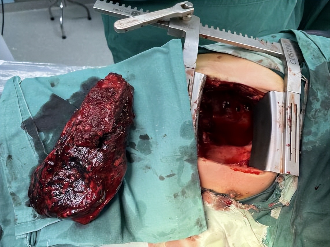 图2:患者手术标本,为肿瘤组织及肋骨成分。