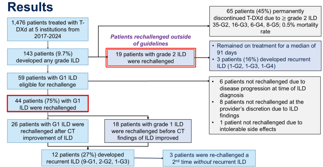 2025年ASCO大会报道了一项来自美国的多中心真实世界研究(RWS)[14],在1476例接受T-DXd治疗的患者中,有44例发生1级ILD的患者接受了T-DXd“再挑战”。在中位“再挑战”治疗215天时,仅有12例患者(27%)发生ILD复发,而且大多数(11/12)复发者仍为1-2级的轻度ILD。在这些ILD复发的患者中,也有3例继续接受第二轮“再挑战”治疗,截至研究报道时仍未发生ILD复发。此外,该研究有另一个19例2级ILD的患者队列,也就是指南认为应该永久停药的患者,也接受了T-DXd“再挑战”,结果显示在中位治疗91天时,仅有3例(16%)ILD复发(2、3、4级各1例)。