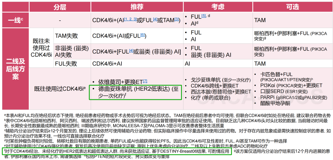 国内最新版的CSCO-BC(2025)、CACA-CBCS精要版(2025)、ABCC指南(2024),针对CDK4/6i+ET经治患者,均推荐T-DXd作为HER2低表达患者的优选方案;而鉴于药物可及性,靶向联合内分泌治疗(如mTORi+ET)在国内指南中仍是CDK4/6i+ET经治患者的优选方案之一,但需注意mTORi目前缺乏CDK4/6i经治的高质量循证医学证据。此外,由于T-DXd超低表达国内适应症尚在审批中,国内指南尚未列入推荐,但已经在注释中引用或介绍了DB-06的循证医学证据。相信随着相关适应症获批,国内指南对T-DXd在post-CDK4/6i中的应用推荐会进一步扩大。